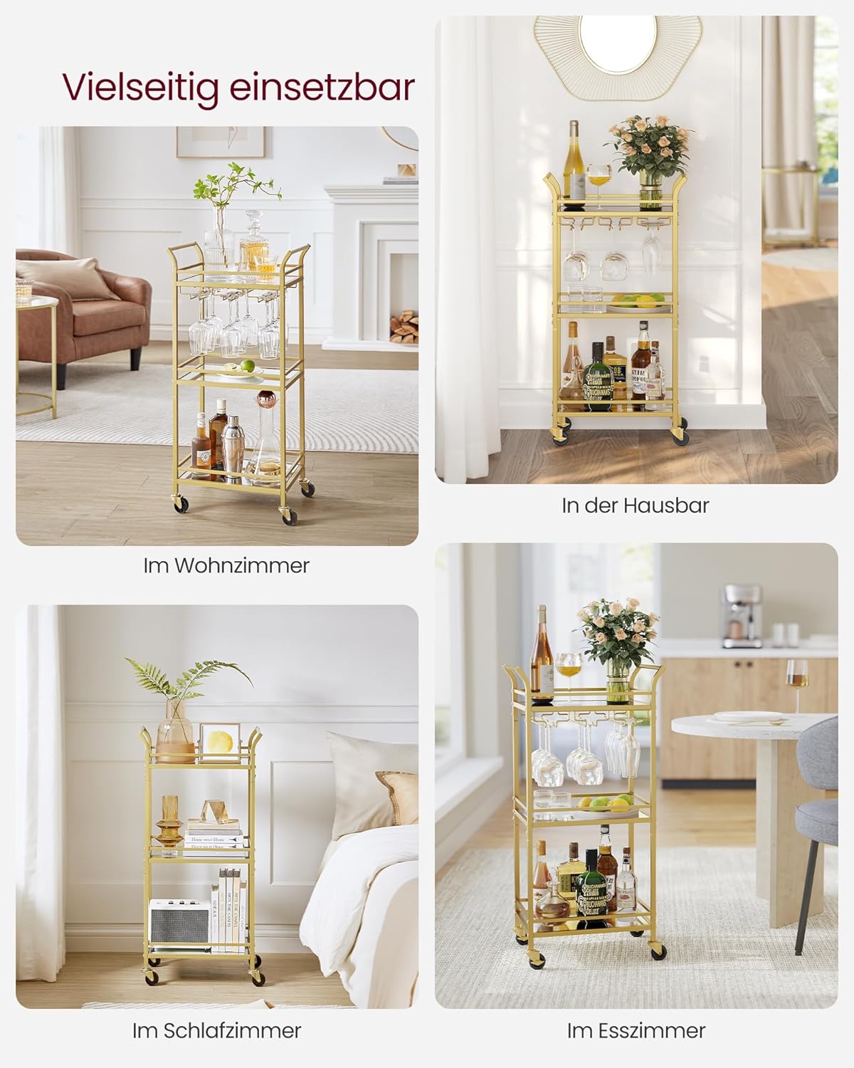 - [Charmante verspiegelte Glasablagen] Die verspiegelten Glasablagen verleihen diesem Servierwagen einen attraktiven Charme. Sie reflektieren wunderschön Ihre Weingläser und -flaschen und bringen Ihrem Zuhause zeitlose Eleganz