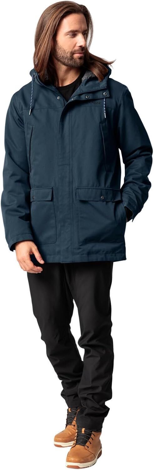 PRODUKTBESCHREIBUNGEN Alle Wetter! Der Manukau Parka ist ein moderner, wetterfester Herren Parka für Stadt und Alltag und wurde in seiner Neuauflage überwiegend aus recycelten Materialien erstellt. Das flauschige Kunstfell im Kapuzeninneren und auf der Rückseite halten schön warm, zudem sorgt die umweltfreundliche, funktionelle Primaloft® Black Eco Wattierung für ein Extra an Wärme an kalten Herbsttagen. Regenschauer und scharfer Wind können dem Besitzer nichts anhaben - durch die eingearbeitete Membran ist der Parka absolut wetterfest und gleichzeitig atmungsaktiv, zudem kann die Kapuze mittels Kordelzug winddicht zugezogen werden. Auffällig ist hier die Vielzahl der Taschen, die fast schon den Rucksack ersetzen: Es gibt zwei aufgesetzte, praktische Aussentaschen, die seitlich und von oben befüllt werden können sowie zwei grosszügige Brusttaschen und eine zusätzliche Innentasche. Smartphone, Geldbörse, Karten, Brille und vieles andere kann hier sicher und mit Reissverschluss geschützt verstaut werden. Der robuste, pflegeleichte Manukau Parka ist perfekt für die Übergangszeit, für mässig kalte Wintertage, für Alltag und Freizeit und vor allem für viele Jahre. Das VAUDE Green Shape-Label steht für ein umweltfreundliches, funktionelles Produkt aus nachhaltigen und bluesign® zertifizierten Materialien.