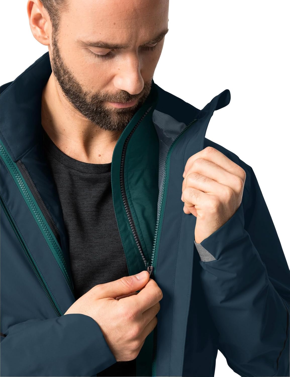 PRODUKTBESCHREIBUNGEN Mit der Yaras 3in1 Jacket sind Radler auf Radreisen und im Winter gegen schlechtes Wetter bestens gerüstet! Die 2,5-lagige Ceplex Active-Membran hält Nässe zuverlässig draussen, wasserdichte Taschen sorgen zudem dafür, dass Karte, Smartphone und andere Wertsachen stets bestens geschützt und trocken bleiben. Die einstellbare Kapuze hält den Kopf auch bei anhaltend schlechtem Wetter trocken, das durchdachte Belüftungssystem sorgt zudem für ein optimales Trageklima. Doch auch die Innenjacke geizt nicht mit Funktion - sie ist im Brustbereich und an den Schultern mit einer Wattierung aus PrimaLoft® Black Insulation 100%Eco versehen, die an sensiblen Stellen für mehr Wärme an kalten Wintertagen sorgt. Zwei Reissverschlusstaschen und Stretch-Einlagen bieten viel Flexibilität in jeder Tragesituation, der Stehkragen verringert Zugluft und garantiert ein ausgezeichnetes Tragegefühl. Die Materialien werden der Umwelt zuliebe nach dem bluesign®-Standard hergestellt. In Kombination mit der Yaras Rain Pants wird das Regenoutfit komplett.Mit reflektierenden Elementen. Dieses Produkt ist mit Eco Finish umweltfreundlich wasserabweisend ohne Fluorcarbone (PFC) hergestellt. Das VAUDE Green Shape-Label steht für ein umweltfreundliches, funktionelles Produkt aus nachhaltigen Materialien.