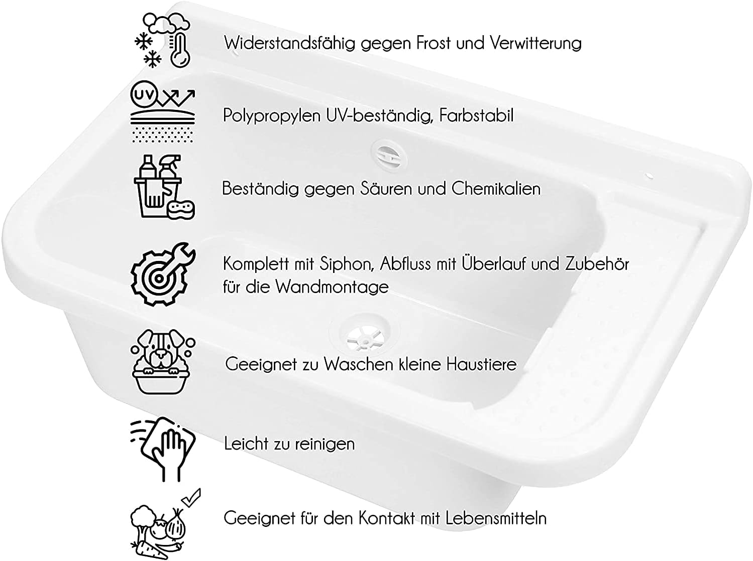 - ✅ Unempfindlich gegen Hitze und Kälte kann es dort montiert werden, wo ein grosses Ausgussbecken benötigt wird. Egal ob neben der Waschmaschine, in Keller, Heizung, Garage, Waschraum, Wirtschaftsraum, Werkstatt, Garten oder anderswo. Es ist