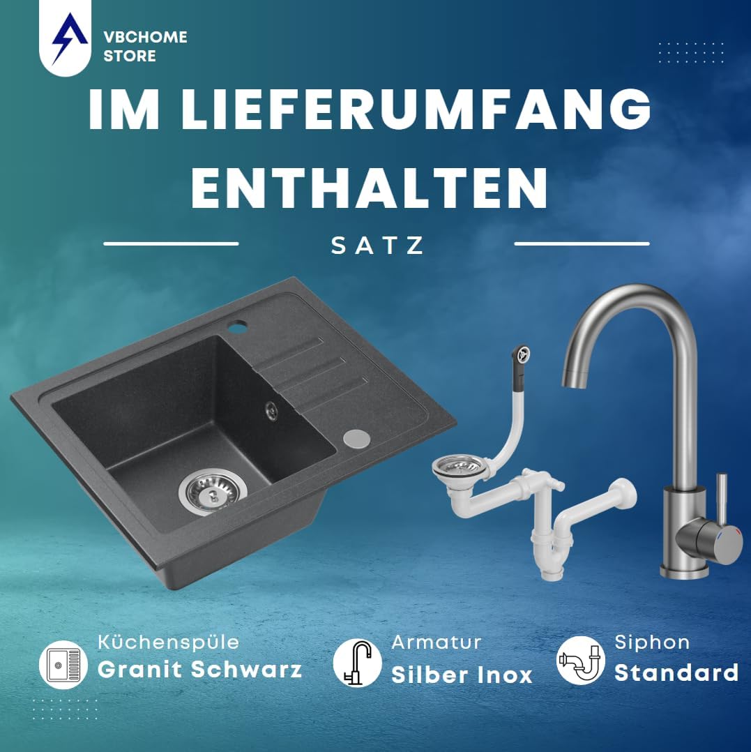 VBChome Spülbecken Granit Schwarz mit Armatur 55 x 44 cm Einzelbecken Einbauspüle Gesprenkelt Revers
