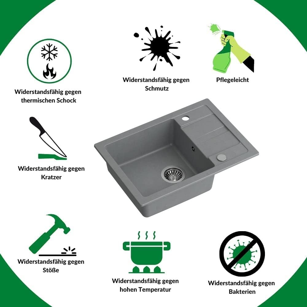 • Mit praktischer Abtropffläche zum Abstellen von Geschirr. Mit Anschluss für eine Waschmaschine oder Geschirrspüler.Die Granit-Küchenspüle ist für den flächenbündigen Einbau konzipiert. Das Waschbecken ist reversibel (links oder rechts) einbaubar.