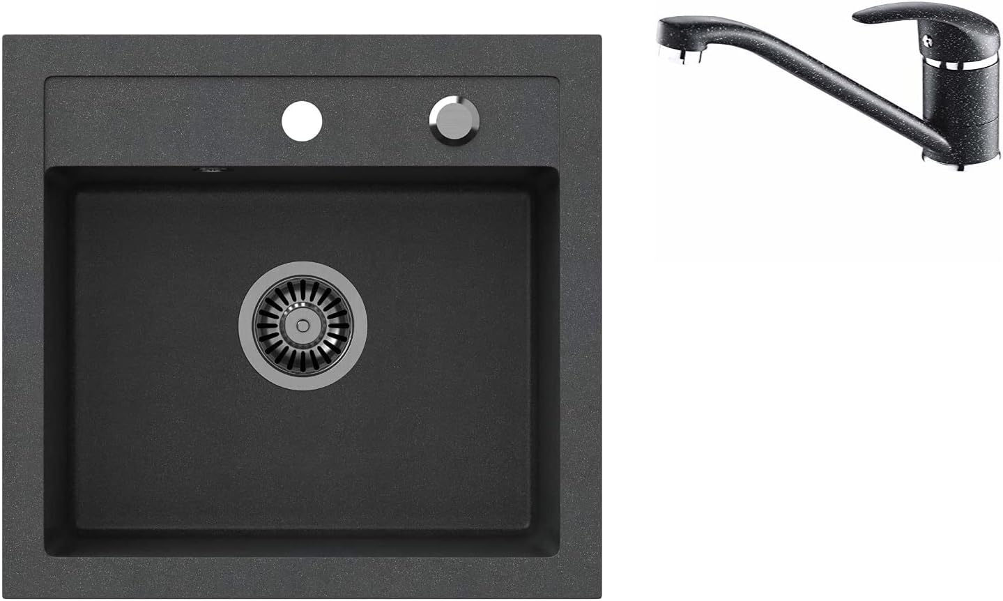 VBChome Spülbecken mit Armatur 50 x 47 cm Schwarz Granit Spüle Einzelbecken Küche Einbauspüle Verbun