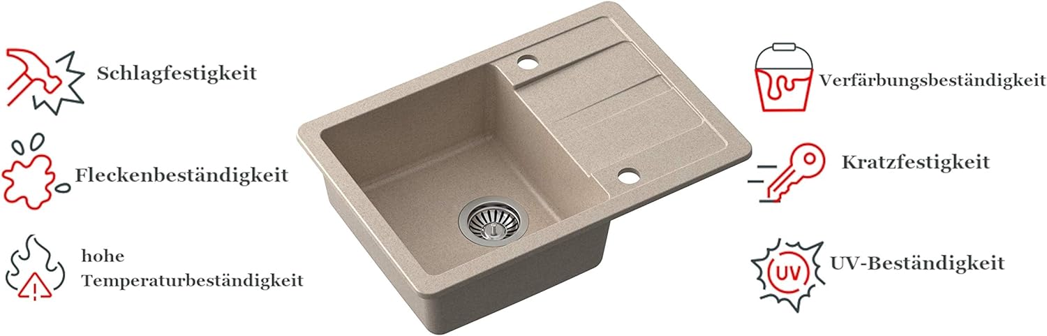 • Moderne massive Granitspüle aus 80% Granitzuschlagstoff 20% Harz. Extrem hartes, kratzfestes und durchgefärbtes Material - Oberfläche lässt sich leicht durch eine glatte, versiegelte Oberfläche reinigen.