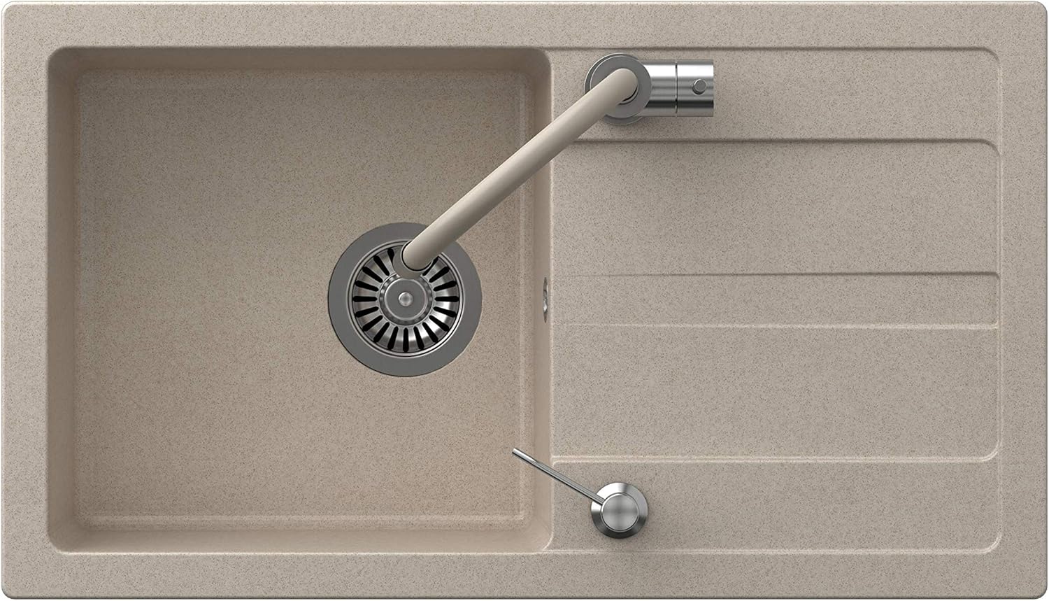 • Mit praktischer Abtropffläche zum Abstellen von Geschirr. Mit Anschluss für eine Waschmaschine oder Geschirrspüler.Die Granit-Küchenspüle ist für den flächenbündigen Einbau konzipiert. Das Waschbecken ist reversibel (links oder rechts) einbaubar.
