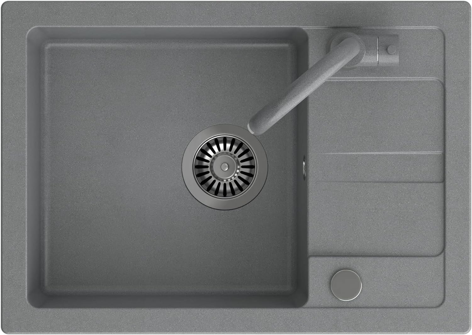 VBChome Spülbecken mit Armatur Grau 62 x 44 cm Granit Einzelbecken Einbauspüle Abtroffläche Gesprenk