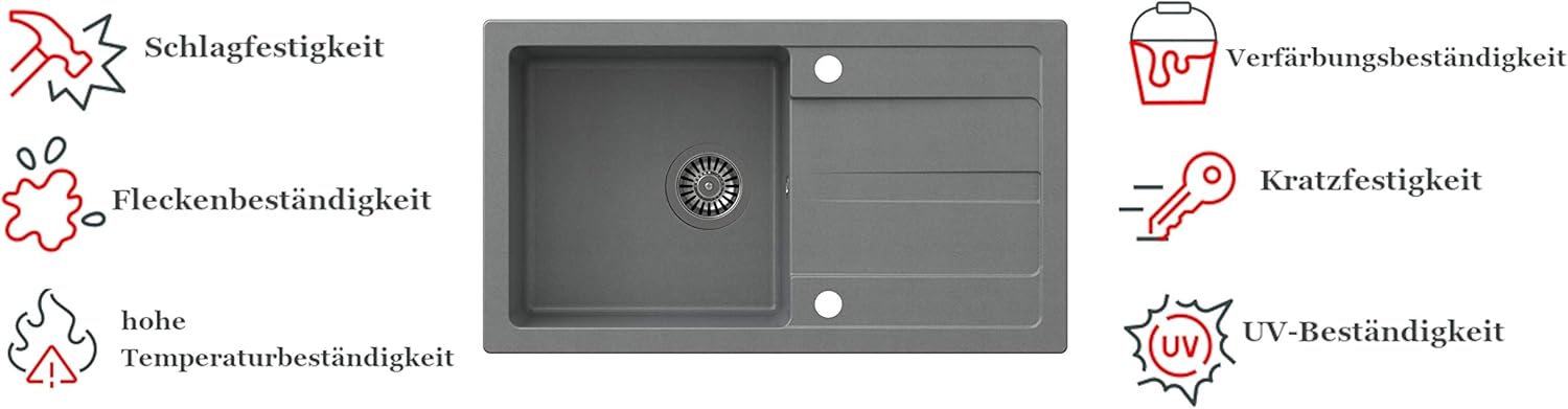- Die besonders leicht zu reinigende Oberfläche hat eine Hitzebeständigkeit bis zu 200 Grad und weist zudem eine hohe Resistenz gegenüber aggressiven Substanzen auf. Gefertigt aus hochwertigem Granitverbundwerkstof ist kratzunempfindlich und bruchfest.