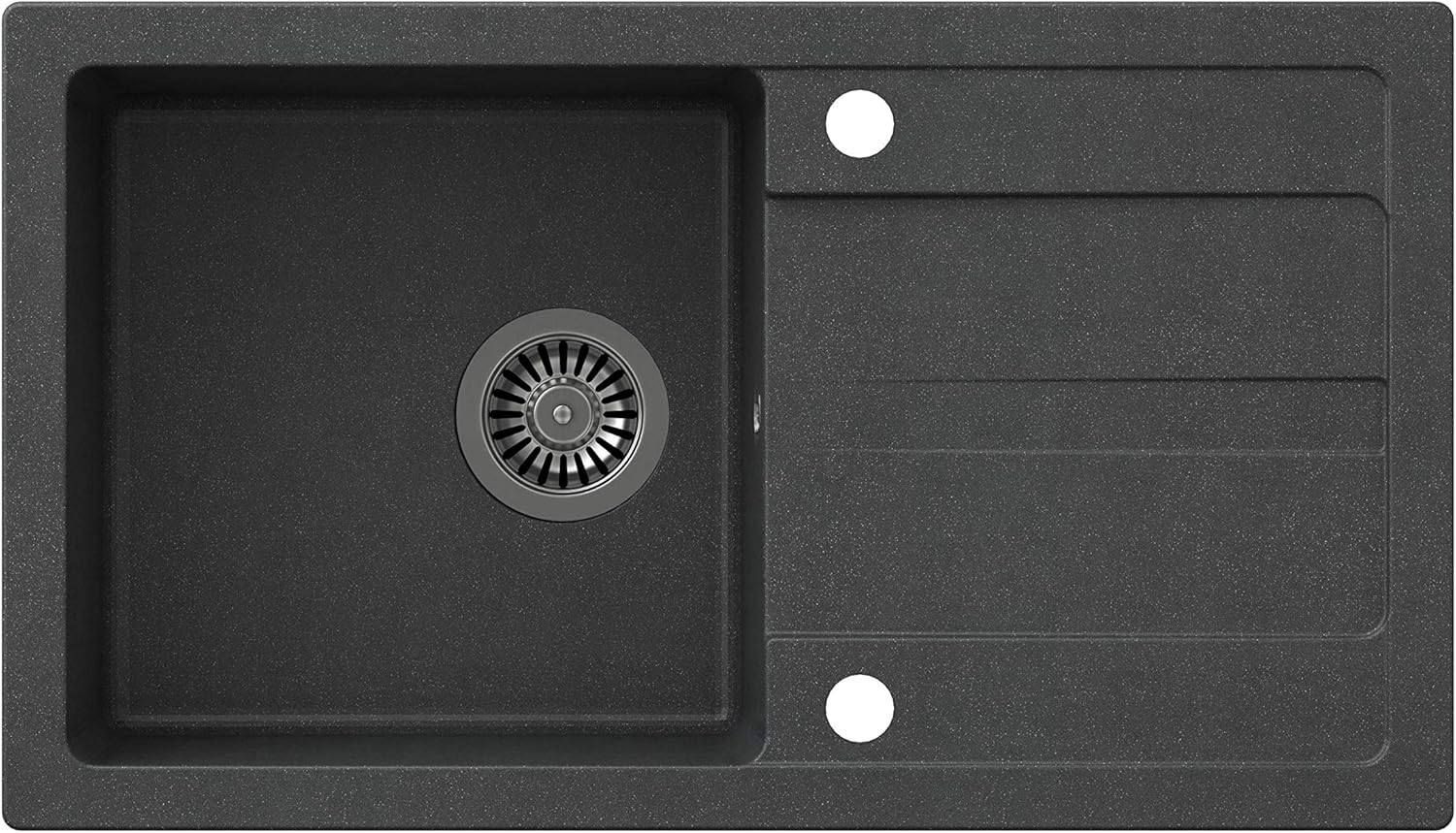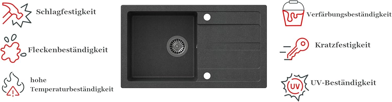 • Moderne massive Granitspüle aus 80% Granitzuschlagstoff 20% Harz. Extrem hartes, kratzfestes und durchgefärbtes Material - Oberfläche lässt sich leicht durch eine glatte, versiegelte Oberfläche reinigen.