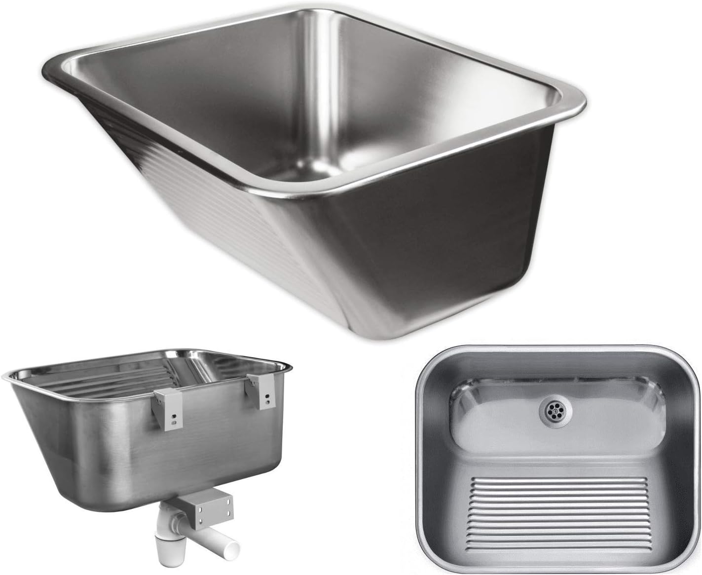 VBChome Ausgussbecken 63x53x25 cm Waschtrog aus Edelstahl Satinstruktur mit Überlauf Ablaufgarnitur
