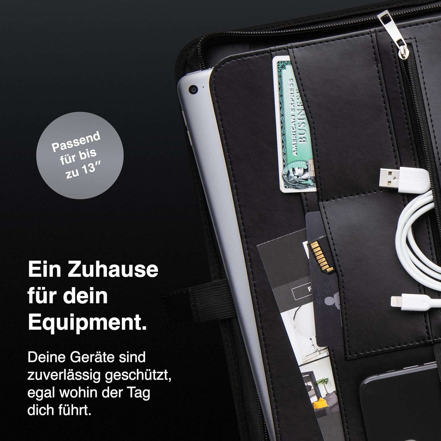 - MEHR PLATZ FÜR DICH – Im inneren der Klemmbrettmappe findest du zahlreiche Fächer und Halterungen für deine Utensilien vor. Zusätzlich bietet dir das grosszügige geteilte Innenfach die Möglichkeit deinen 13 Zoll Laptop und Tablet sicher