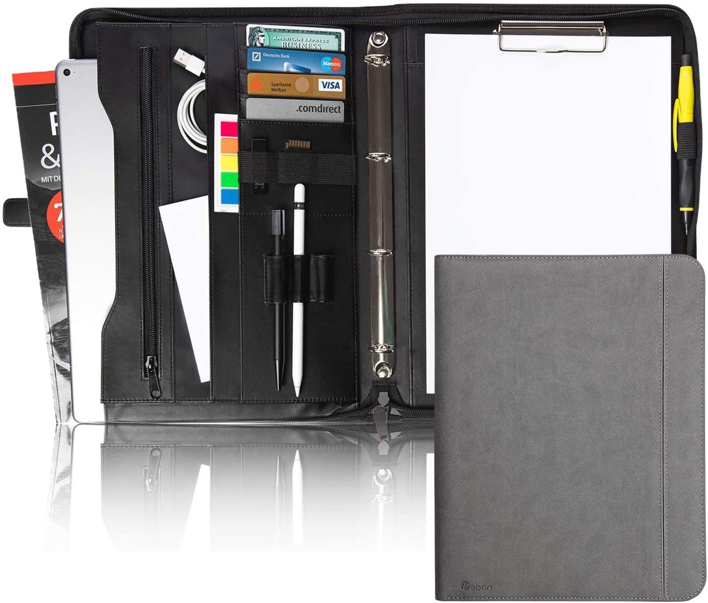 - MEHR PLATZ FÜR DICH – Im inneren der Klemmbrettmappe findest du zahlreiche Fächer und Halterungen für deine Utensilien vor. Zusätzlich bietet dir das grosszügige geteilte Innenfach die Möglichkeit deinen 13 Zoll Laptop und Tablet sicher