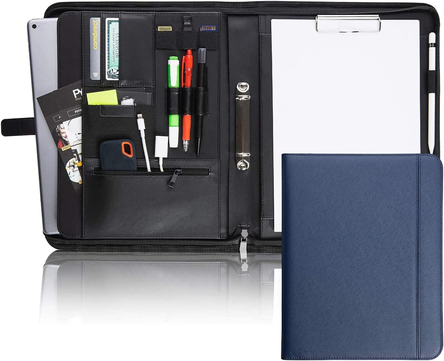 - MEHR PLATZ FÜR DICH – Im inneren der Klemmbrettmappe findest du zahlreiche Fächer und Halterungen für deine Utensilien vor. Zusätzlich bietet dir das grosszügige geteilte Innenfach die Möglichkeit deinen 13 Zoll Laptop und Tablet sicher