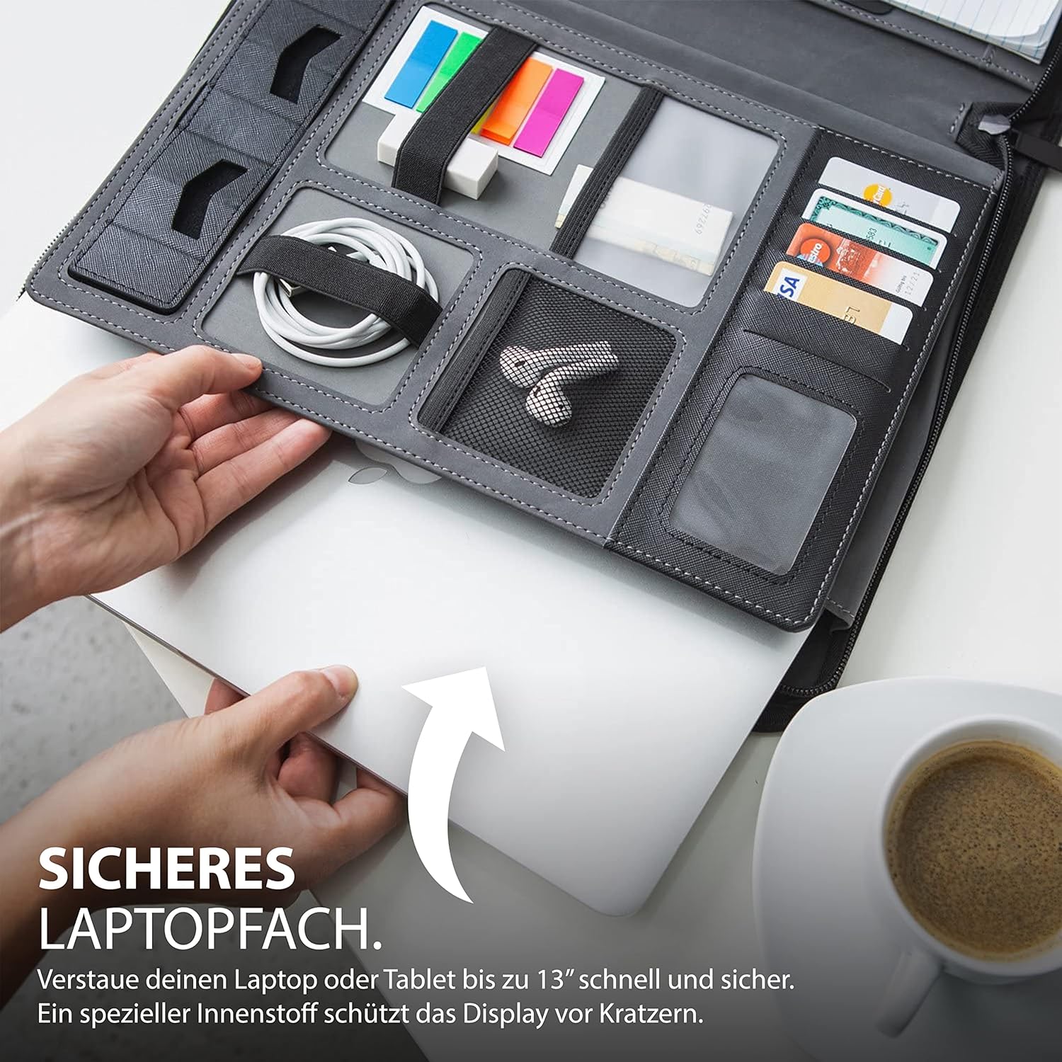 - ALLES HAT SEINEN PLATZ – Im inneren der Schreibmappe findest du zahlreiche Fächer und Halterungen für deine Utensilien vor. Zusätzlich bietet dir das grosszügige Innenfach die Möglichkeit deinen 13 Zoll Laptop oder Tablet sicher aufzubewahren.