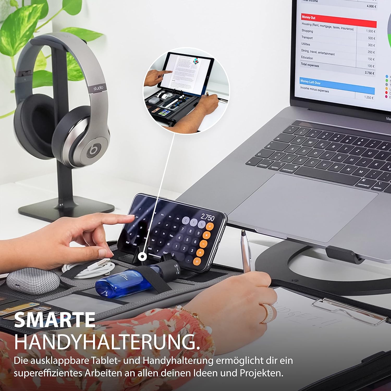 - FUNKTIONELLES ARBEITEN – Die integrierte Handy- und Tablethalterung ermöglicht dir eine angenehme Ausrichtung und Positionierung von Display und Kamera. Somit kannst du ganz entspannt Videotelefonie halten oder deine neusten Dokumente ansehen,