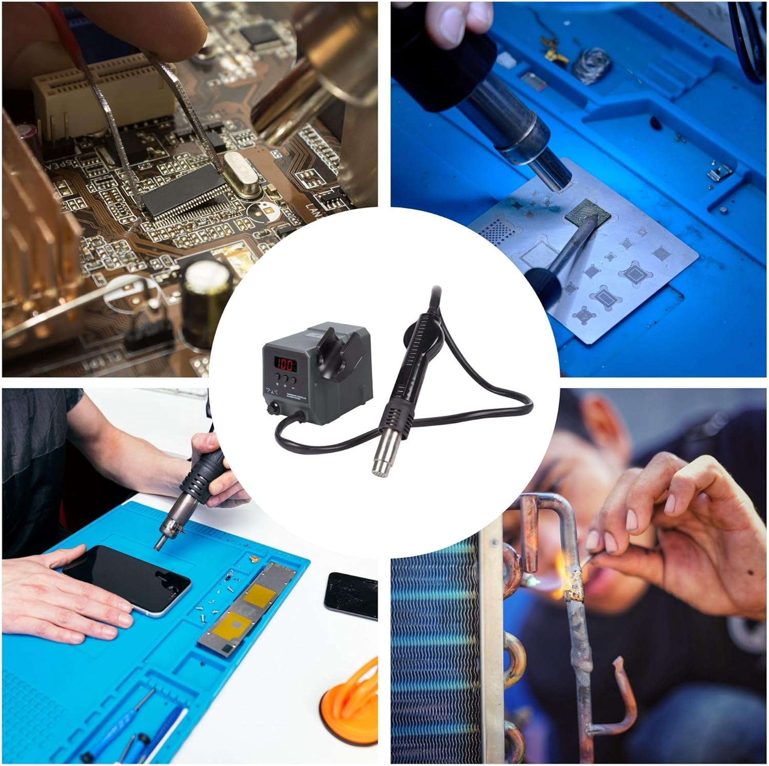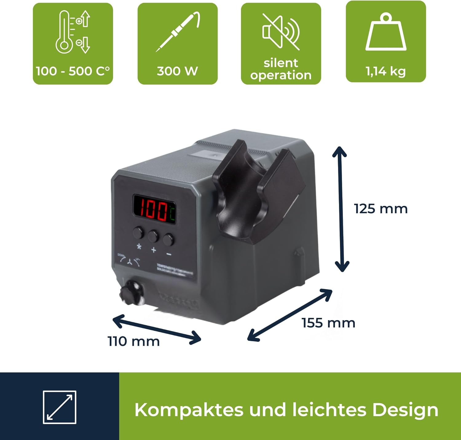 PRODUKTBESCHREIBUNGEN Eigenschaften: * automatische Standby-Funktion * regelbare Luftzufuhr und Temperatur für verschiedene Anwendungen * automatisches Kühlsystem und automatische Abschaltung * kompatibel mit verschiedenen Mundstücken * schnelle Aufheizung * kann als Heissluftpistole verwendet werden * der Bürstenmotor gewährleistet einen stufenlosen Luftstrom, eine lange Lebensdauer und ein geräuscharmes Funktionieren Technische Daten: * automatische Standby-Funktion * regelbare Luftzufuhr und Temperatur für verschiedene Anwendungen * automatisches Kühlsystem und automatische Abschaltung * kompatibel mit verschiedenen Mundstücken * schnelle Aufheizung * kann als Heissluftpistole verwendet werden * der Bürstenmotor gewährleistet einen stufenlosen Luftstrom, eine lange Lebensdauer und ein geräuscharmes Funktionieren * Stromversorgung: 220-240 VAC 50 Hz * Stromverbrauch: 300 W * Temperaturbereich: 100 °C - 500 °C * Abmessungen: 125 x 110 x 155 mm * Gewicht: 1,2 kg