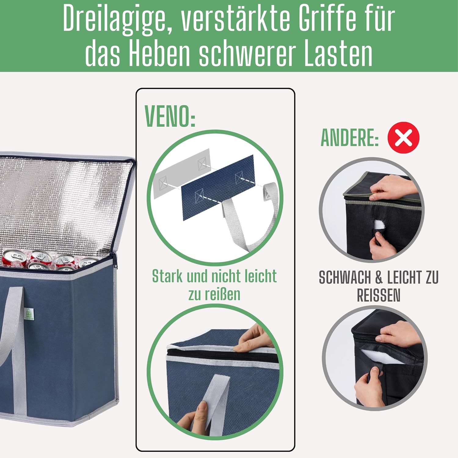 - WIEDERVERWENDBAR: VENO maximiert die Nutzung von Post-Consumer-Materialien, um hochwertige, nachhaltige Einkaufstaschen herzustellen, die verhindern, dass Plastik in Ozeanen, Seen und Deponien landet. Dies hilft, unsere Umwelt zu schützen und eine