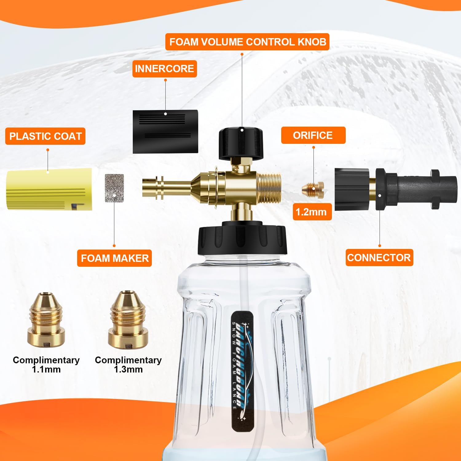 - 【Kompatibilitäts- und Upgrade-Design】 Diese Schneeschaumlanze ist für Hochdruckreiniger der Kärcher K-Serie K2-K7. Sie ist mit einer transparenten Flasche ausgestattet, mit der Sie das Innere der Flasche klarer sehen können. Die breite Öffnung