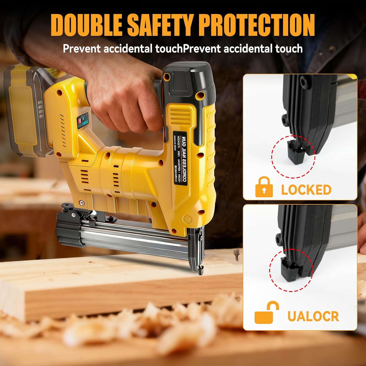 - Sicherheitsdesign: Die kabellose Nagelpistole verfügt über einen doppelten Schutzmechanismus aus Schalter und Sicherheitskontakt. Nägel oder Klammern können nur abgeschossen werden, wenn der Sicherheitsstift vollständig gegen die Arbeitsfläche