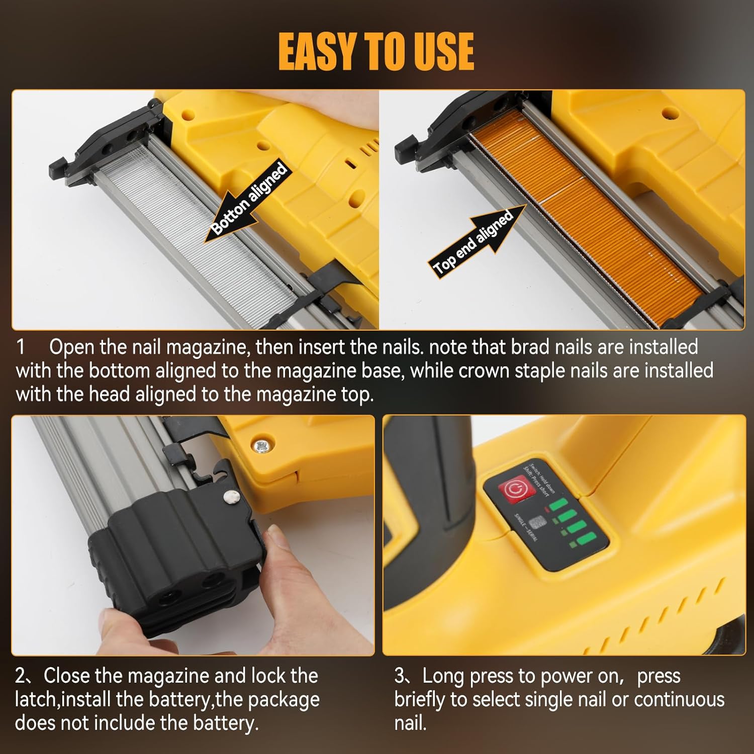 - 2 Nagelmodi: Dieser Nagler bietet zwei benutzerfreundliche Auslösemodi. Der Einzelauslösemodus ermöglicht Ihnen eine präzise Steuerung, wobei jeweils ein Nagel geschossen wird. Der Kontaktmodus ermöglicht schnelles, kontinuierliches Nageln für
