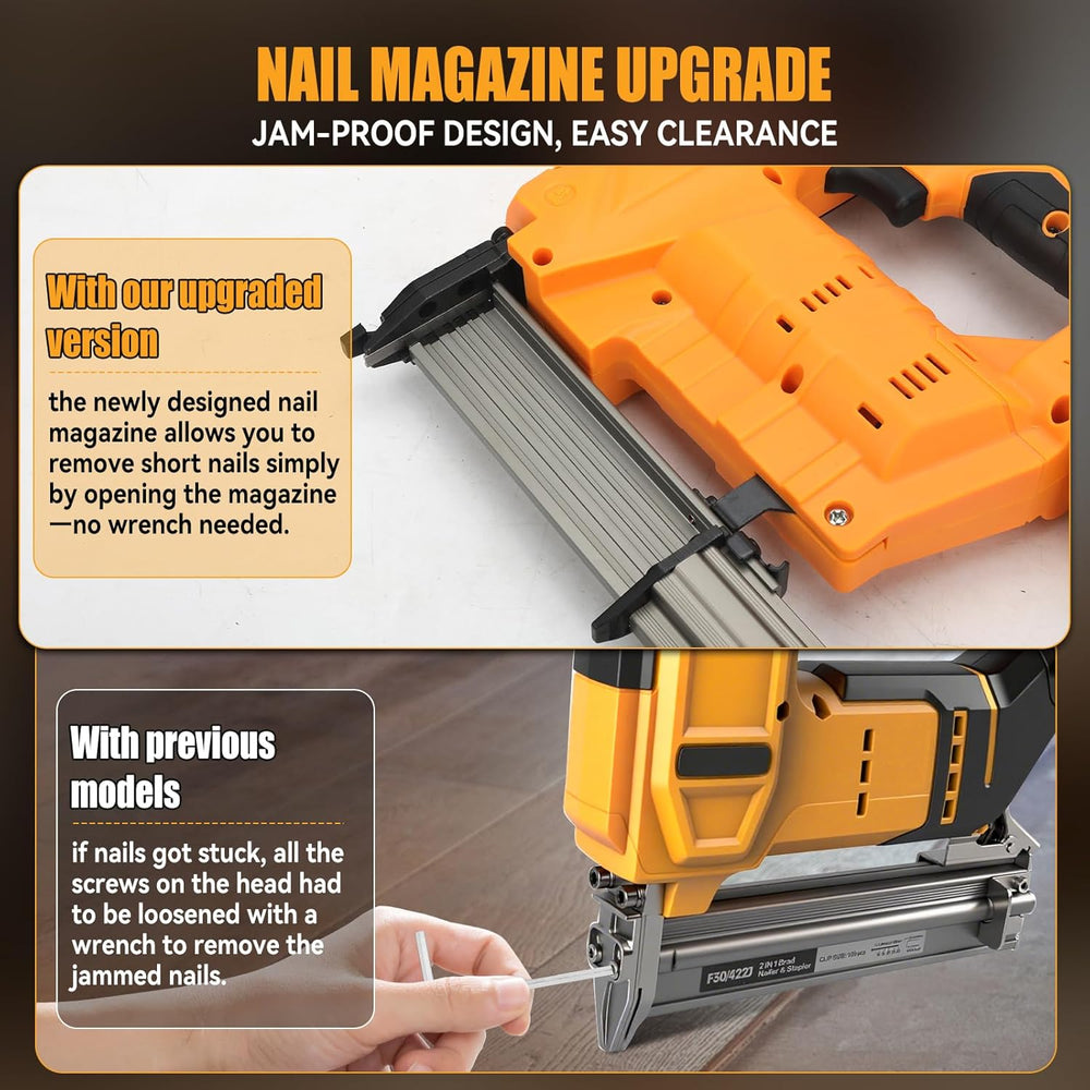 - Hochleistungsmotor und klemmfreies Design: Die Nagelbox wurde verbessert, um ein Verklemmen der Nägel zu verhindern. Der verbesserte 50-W-Kupfermotor treibt bis zu 60 Nägel pro Minute an und reduziert gleichzeitig das Verklemmen. Der leistungsstarke