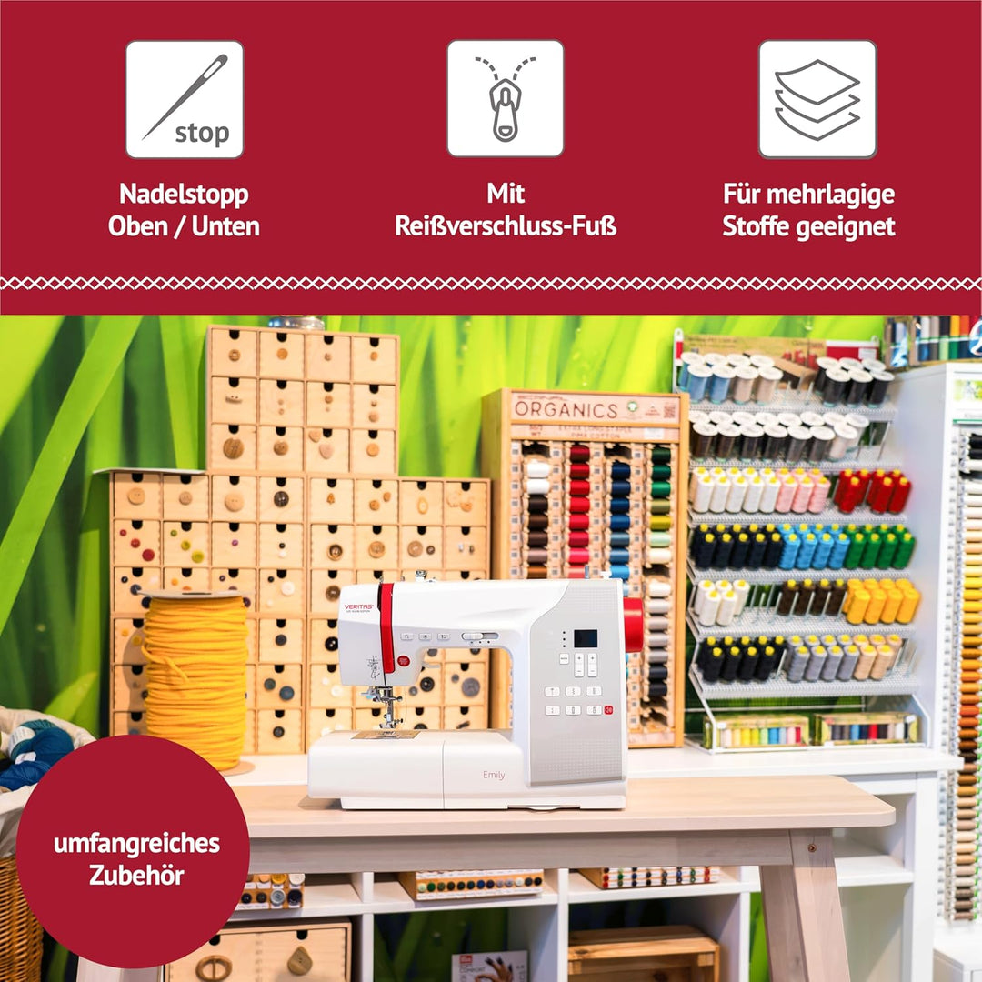 - MIT KNOPFLOCH- & STOPF-AUTOMATIK - Dank der Knopfloch-Automatik gelingen Knoplöcher im Handumdrehen und vollautomatisch. Es muss lediglich der korrekte Knopflochfuss angebracht werden - den Rest übernimmt die Maschine. Die Nähmaschine Emily hat 3