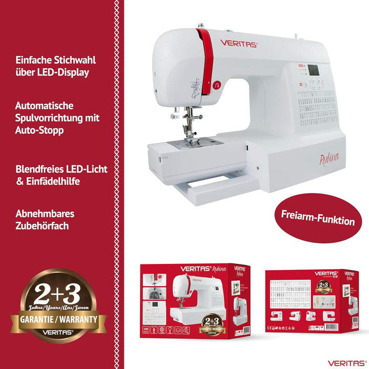 - COMPUTERGESTEUERT: Das Nähmaschinen-Modell VERITAS Rubina überzeugt mit modernem LED-Display zur Wahl aus 100 Nähprogrammen wie Nutz-, Elastik-, Overlock-, Satin-, Kreuz-, Quilt- und Dekorstichen