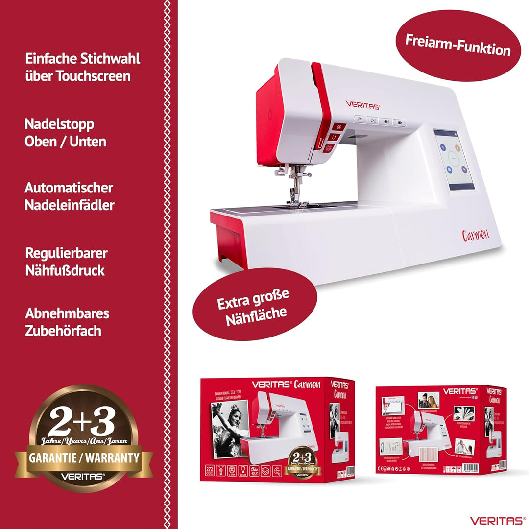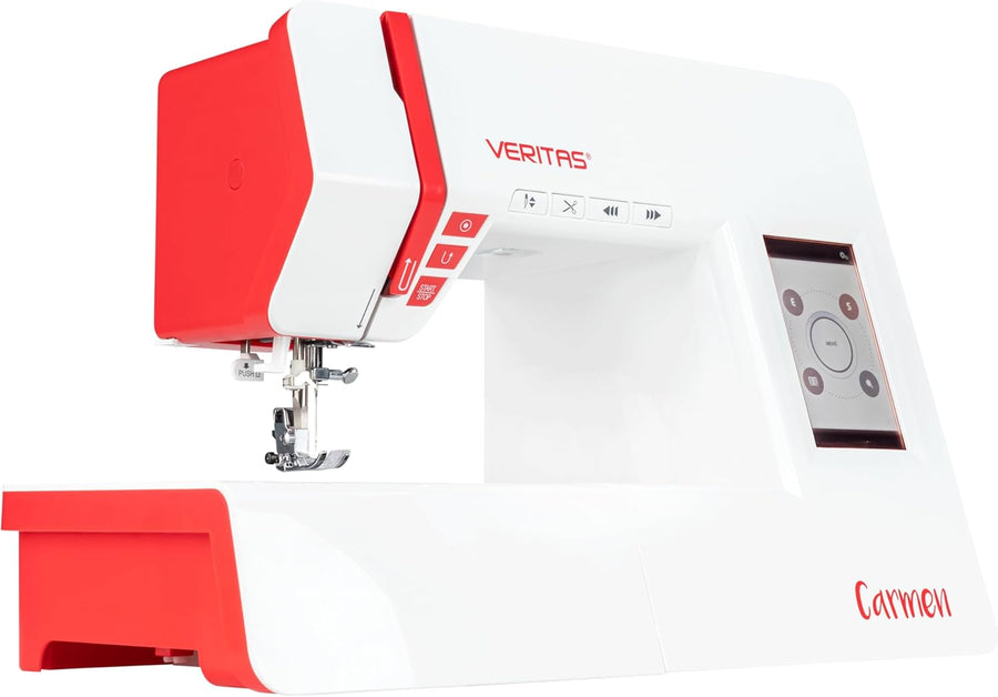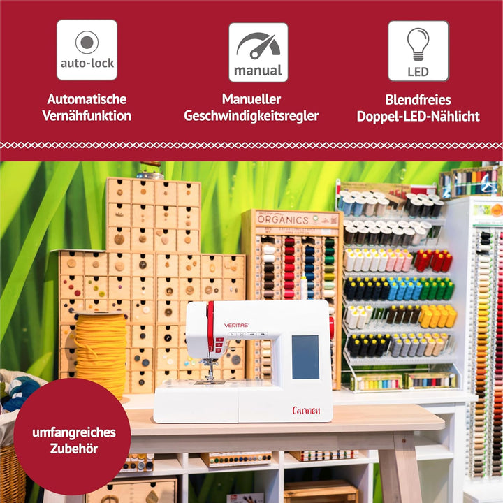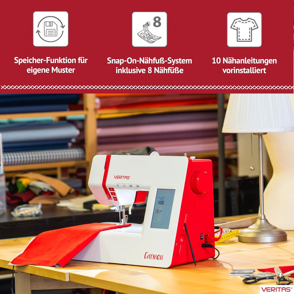 - Automatischer Fadenabschneider, Memory- und Auto-Lock-Funktion zur Nahtversäuberung. Die VERITAS Carmen kann ganz einfach per Knopfdruck gestartet werden.