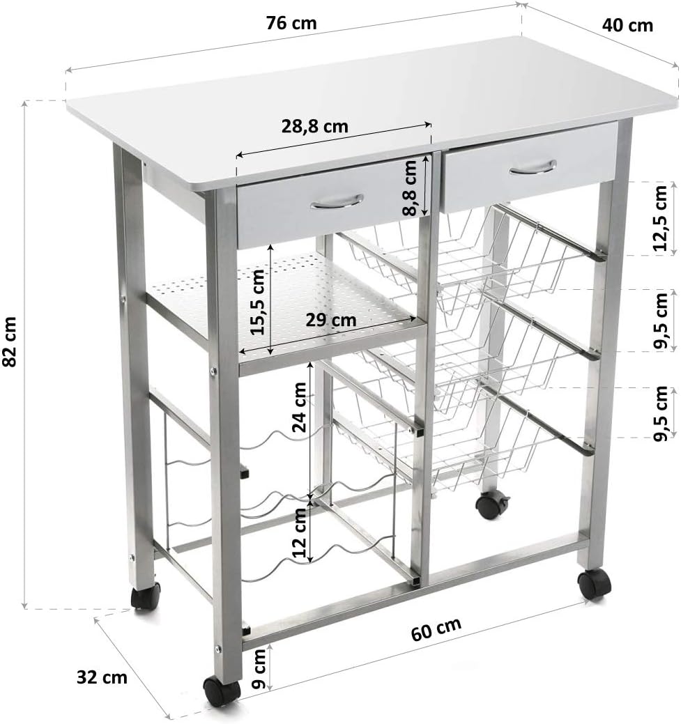 • EIGENSCHAFTEN - Der Küchenwagen hat die perfekte Grösse für den Speisesaal, den Salon oder die Küche. Der Speisewagen ist 82 cm hoch, und hat eine Länge (Tiefe) von 40 cm, und eine Breite (von Seite zu Seite) von 76 cm. Das Gewicht beträgt 12,7