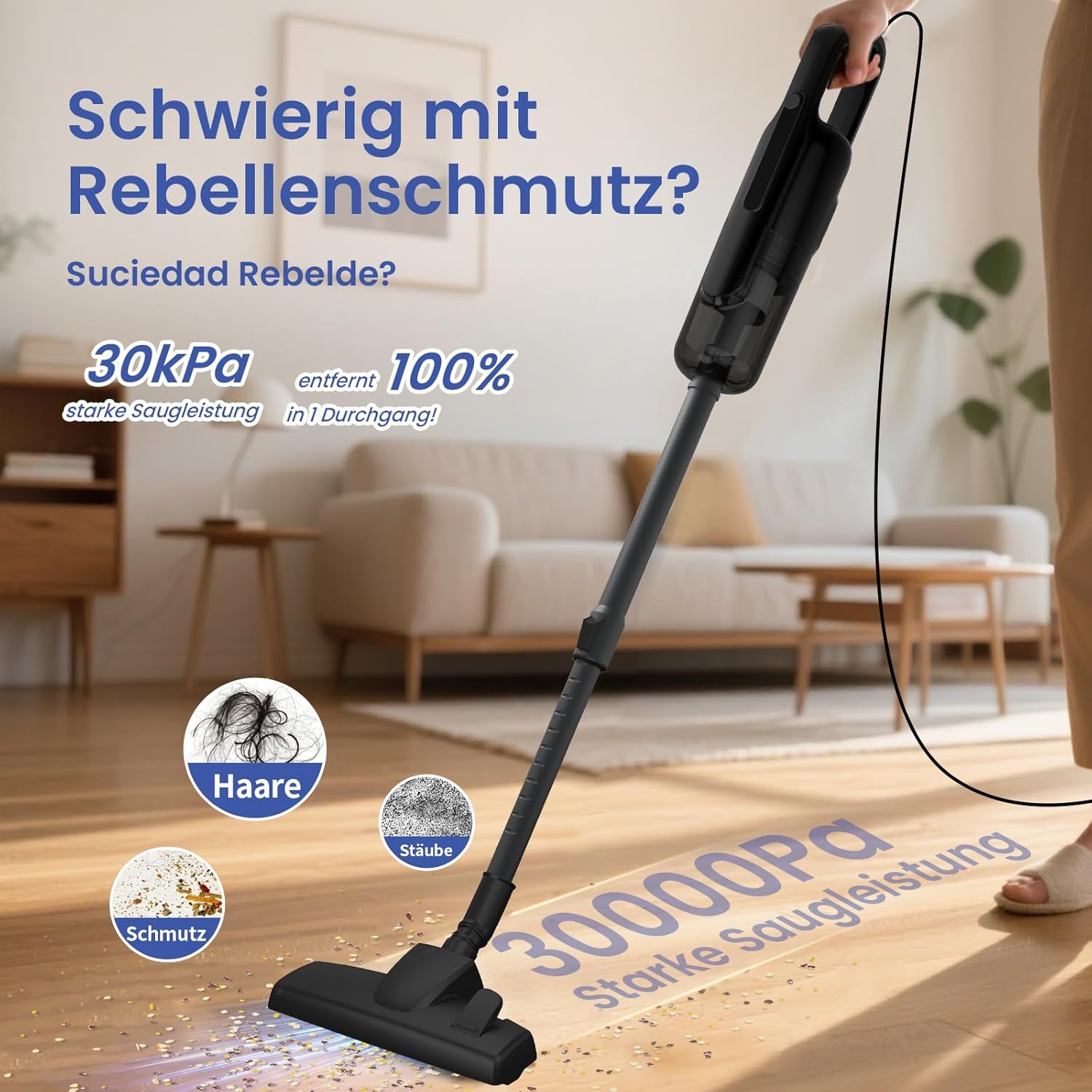 - 【Mit 5 m Kabellänge für unterbrechungsfreies Reinigen】Dank des extra langen Netzkabels eignet sich der Stielstaubsauger mit Kabel besonders für Wohnungen bis ~50 m²: mehrere Räume in einem Durchgang saugen, ohne ständig die Steckdose wechseln
