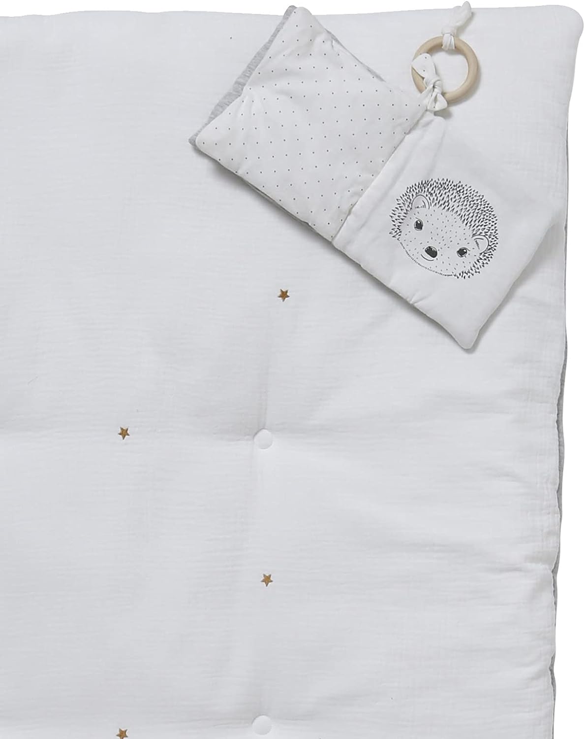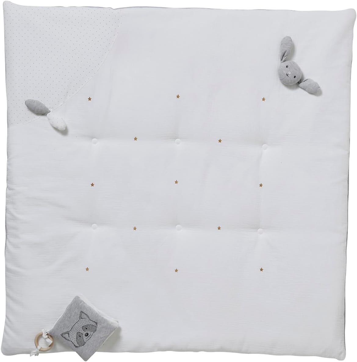 - Spielzeuge mit dem Teppich verbunden: 1 x Hase mit geprägten Ohren, 1 x Holzrassel in Bärenform, fliegende Blätter, 1 x gedrucktes Buch mit knusprigem Papier.