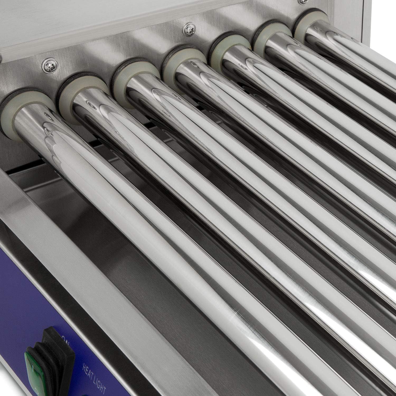 - QUALITÄT: Der vertes Hot Dog Maker hat 7 leistungsstarke Heizwalzen zum Grillen und Warmhalten von Hot Dog Würstchen, die Edelstahl Heizwalzen rotieren um die eigene Längsachse, so müssen die Würstchen nicht gewendet werden