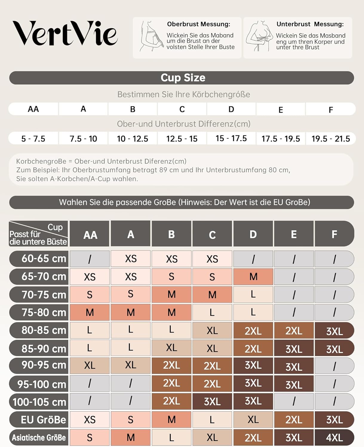 - Die obige Grössentabelle ist eine europäische Standardgrösse. Bitte bestellen Sie entsprechend der tatsächlichen europäischen Grösse. Wenn Ihr Rücken relativ dick ist, wird empfohlen, einen grösseren BH zu bestellen. Da wir asiatische Verkäufer