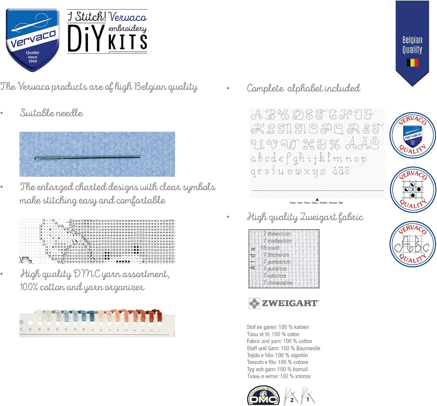 - PREMIUM QUALITÄT - Vervaco ist ein Belgischer Hersteller für hochwertige Stickset. Der 100% Baumwoll Stoff mit 5,4 Stiche/cm in weiss und das DMC - Stickgarn bestechen durch 26 zarten Farben und einem zeitlosen Baby Motiv.
