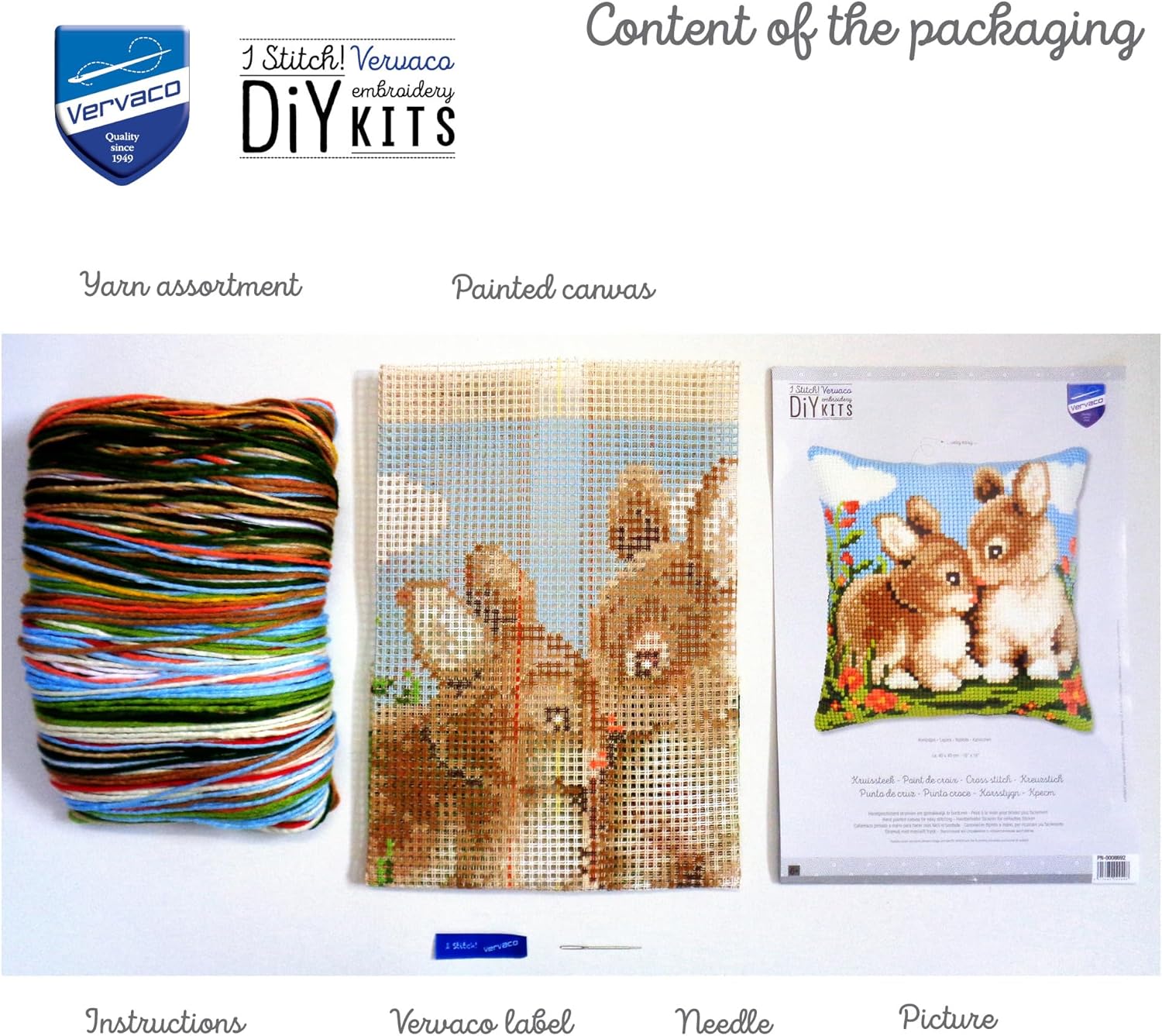• Inklusive handbemaltem groben Stramin aus 100% Baumwolle, Stickwolle aus 100% Acryl sowie Nadel und Anleitung.