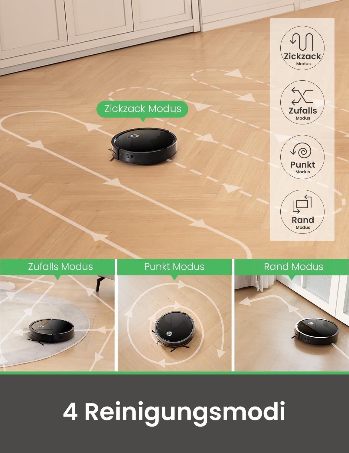 • 【4 Professionelle Modi】:Der Saugroboter ohne Wischfunktion verfügt über vier professionelle Reinigungsmodi: Der Zickzack-Modus für eine effiziente Flächenreinigung, der Zufall-Modus für komplexe Grundrisse, der Punkt-Modus für die intensive