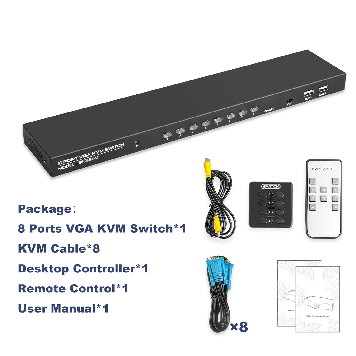 - [ 8 Port VGA KVM Switch ]: Eingang: Max. 8 PCs. Ausgang: 1 VGA Port und 4 USB2.0 Ports. Vollständig kompatibel mit den meisten USB 2.0 Geräten, wie Monitor und Maus, Tastatur, Drucker, Scanner, USB-Laufwerk.