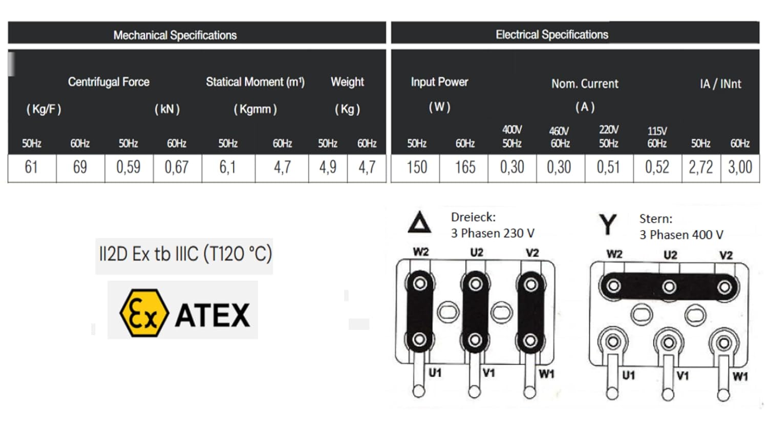 - Drehstrommotor: (3x230V / 400V Stern/Dreieck). 50Hz