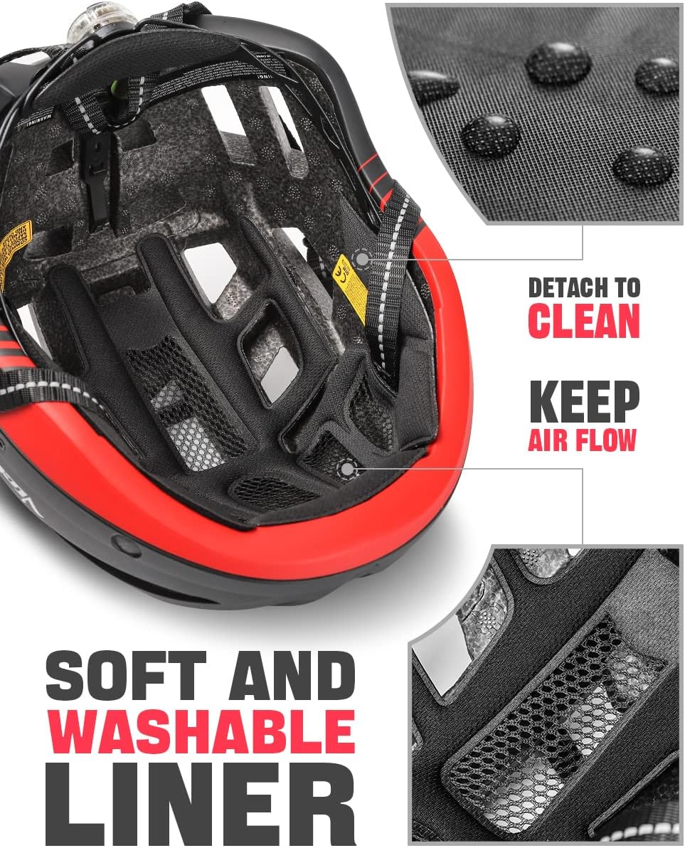 - Atmungsaktiv: Spezielles aerodynamisches Design und 21 atmungsaktive Belüftungsöffnungen des Bike Helms reduzieren den Luftwiderstand und das Schwitzen effektiv. Das abnehmbare Innenfutter kann Schweiss absorbieren und hält Ihren Kopf kühl und fühlt