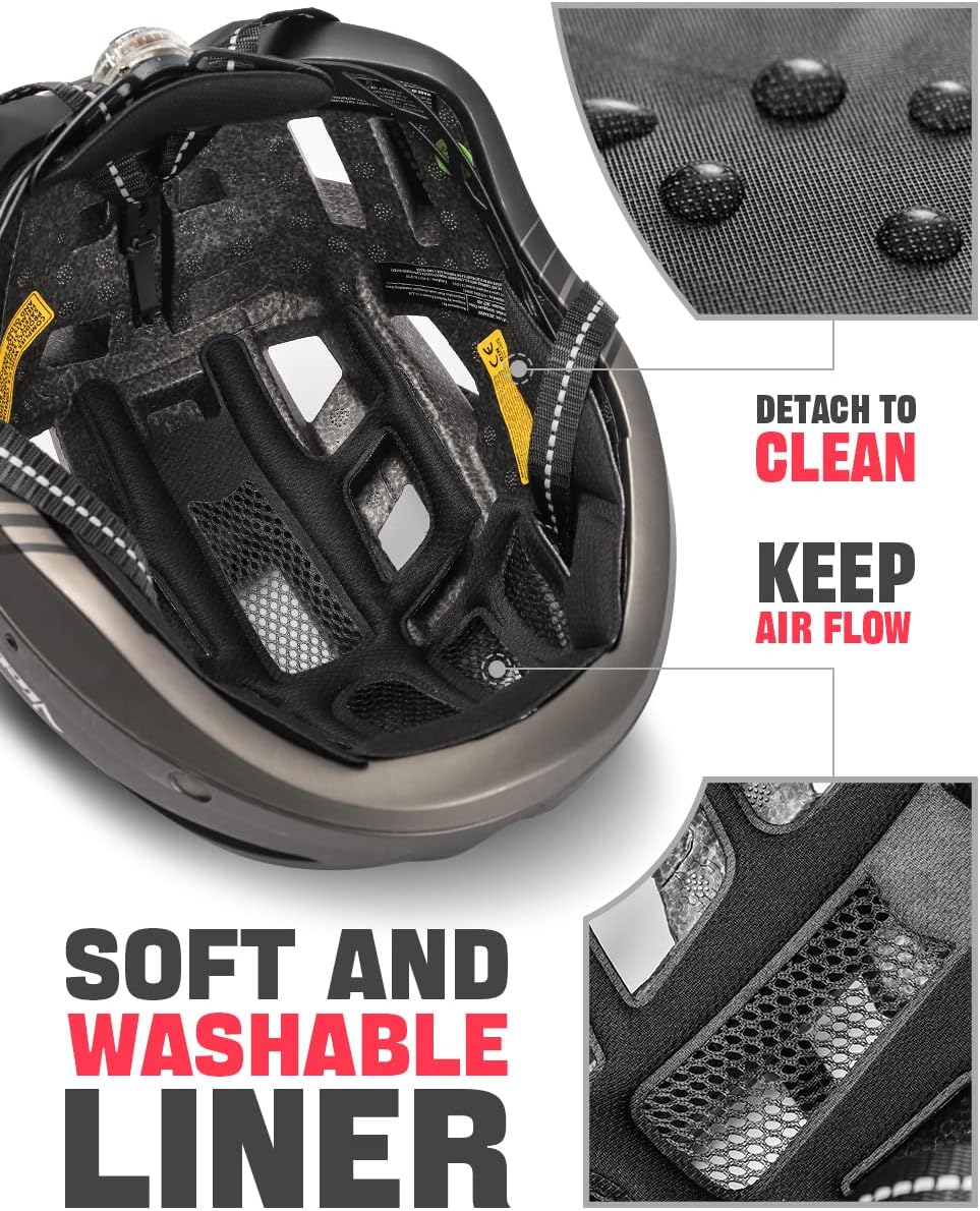 - Atmungsaktiv: Spezielles aerodynamisches Design und 21 atmungsaktive Belüftungsöffnungen des Bike Helms reduzieren den Luftwiderstand und das Schwitzen effektiv. Das abnehmbare Innenfutter kann Schweiss absorbieren und hält Ihren Kopf kühl und fühlt