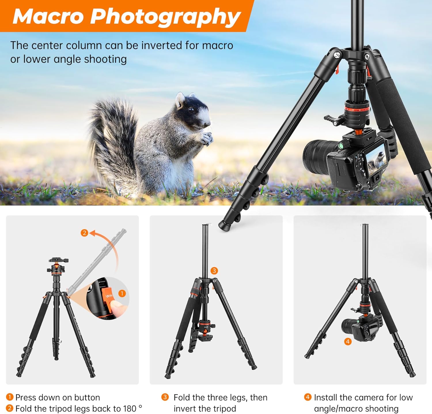 • 🌈【Multifunktionales Kamera Stativ】2 in 1 Stativ kann als Kamerastativ verwendet werden, ebenso wie ein Einbeinstativ (mit der MittelsĂ€ule und dem Beinrohr entfernt und installiert) und ein Makrostativ (mit dem Beinrohr um 180 Grad gefaltet). Sie