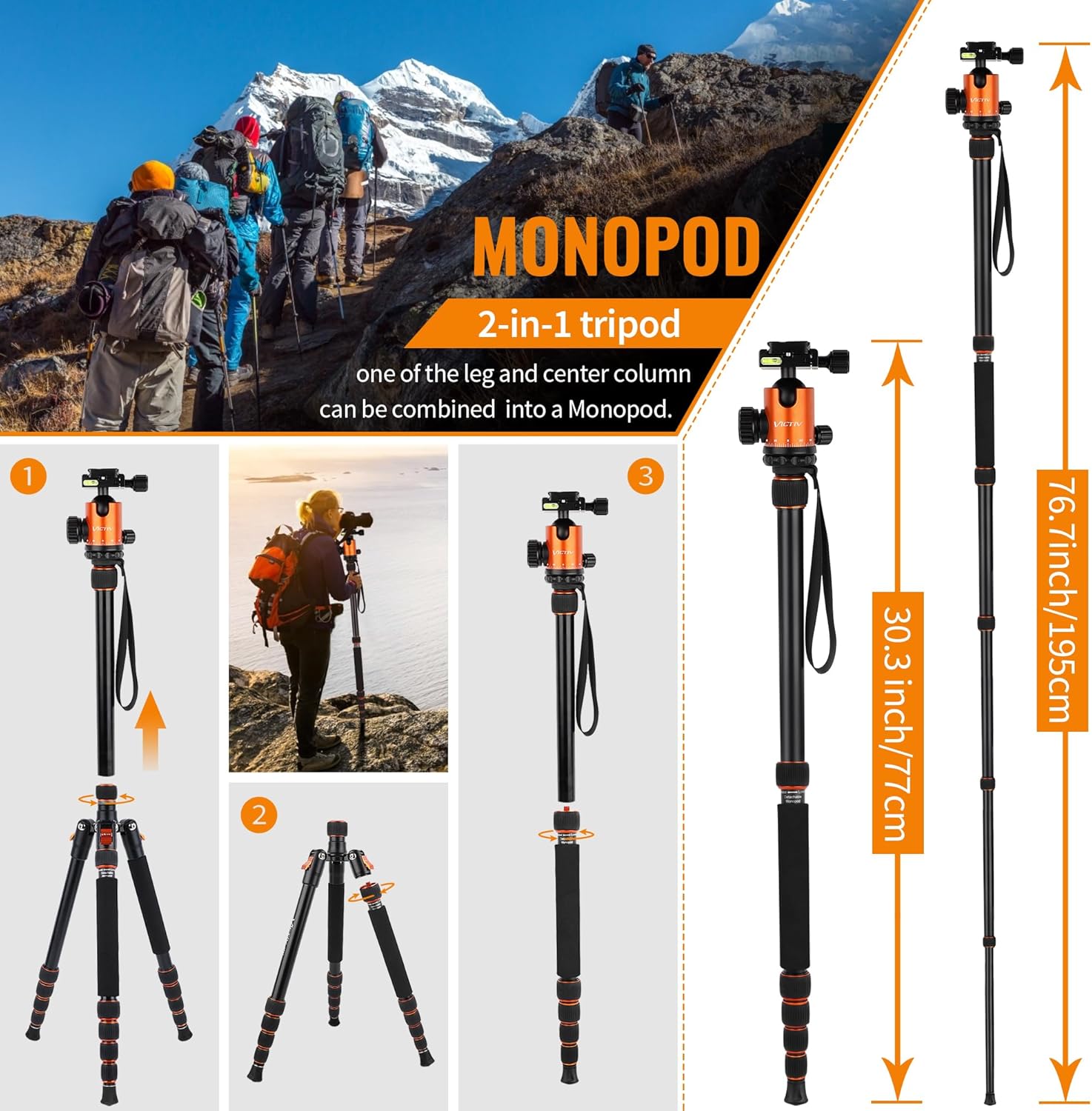 • Professionelles Kamera-Einbeinstativ: Das vielseitige Kamerastativ verfügt über eine abnehmbare Mittelsäule und ein abnehmbares Stativbein. Mit einer einfachen Kombination können sie in ein höhenverstellbares Einbeinstativ (78.7 cm-205.7 cm)