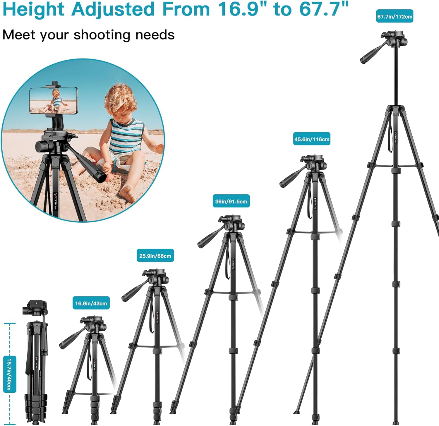 • đŸ“·ă€Stabiles Stativ】 5-teilige Beine. Die Höhe kann von 43cm/16,9inch bis 67,7in/172cm verlĂ€ngert werden. Die Beine bestehen aus einer hochwertigen Aluminiumlegierung, die robust und langlebig ist. ErfĂŒllen Sie die Anforderungen verschiedener