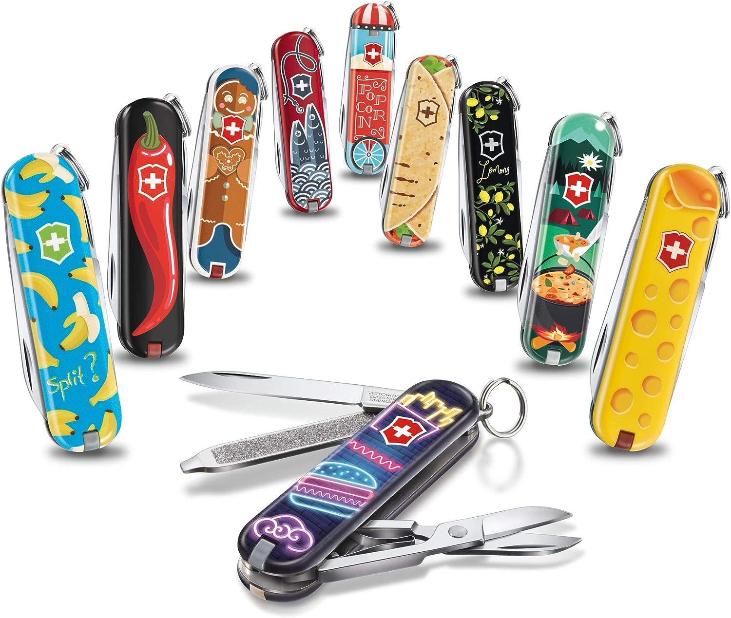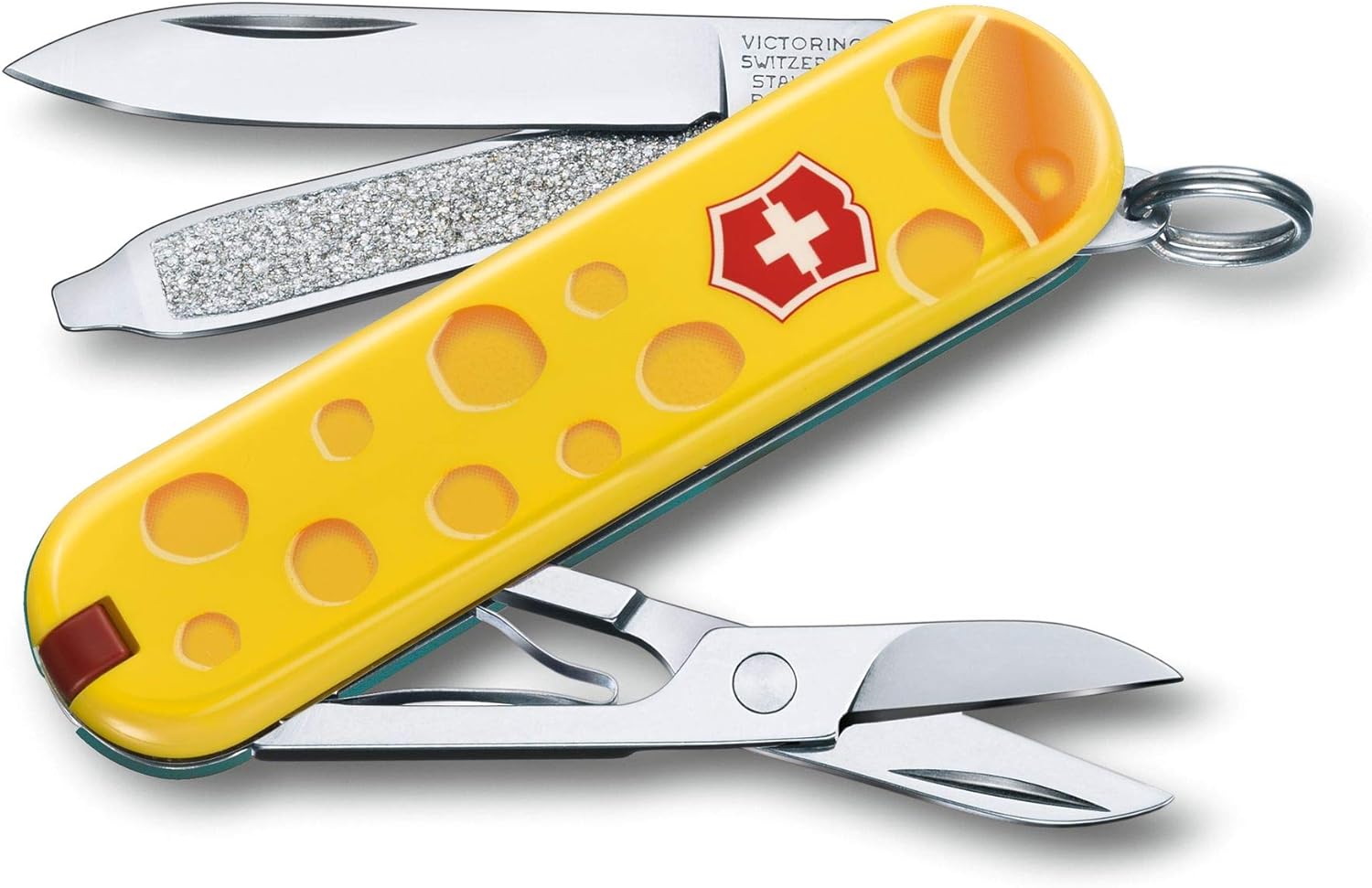 - Taschenmesser mit sieben Funktionen, hergestellt in der Schweiz: Klinge, klein; Schere, Nagelfeile; Schraubendreher 2,5 mm; Schlüsselanhänger; Zahnstocher; Pinzette