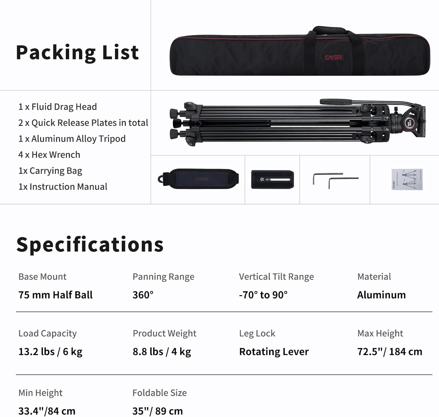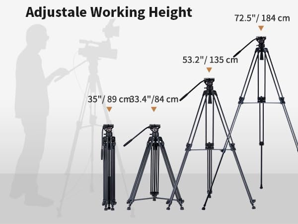 - - 13,2 lb Ladekapazität | 33" bis 72" Höhenbereich | Neigungswinkel +90° / -70° | 360°-Schwenken | 75 mm Kugeldurchmesser | Tragetasche | Flüssigkeitskopf | Stativbein für Videokameras | 2 Stück Schnellwechselplatten