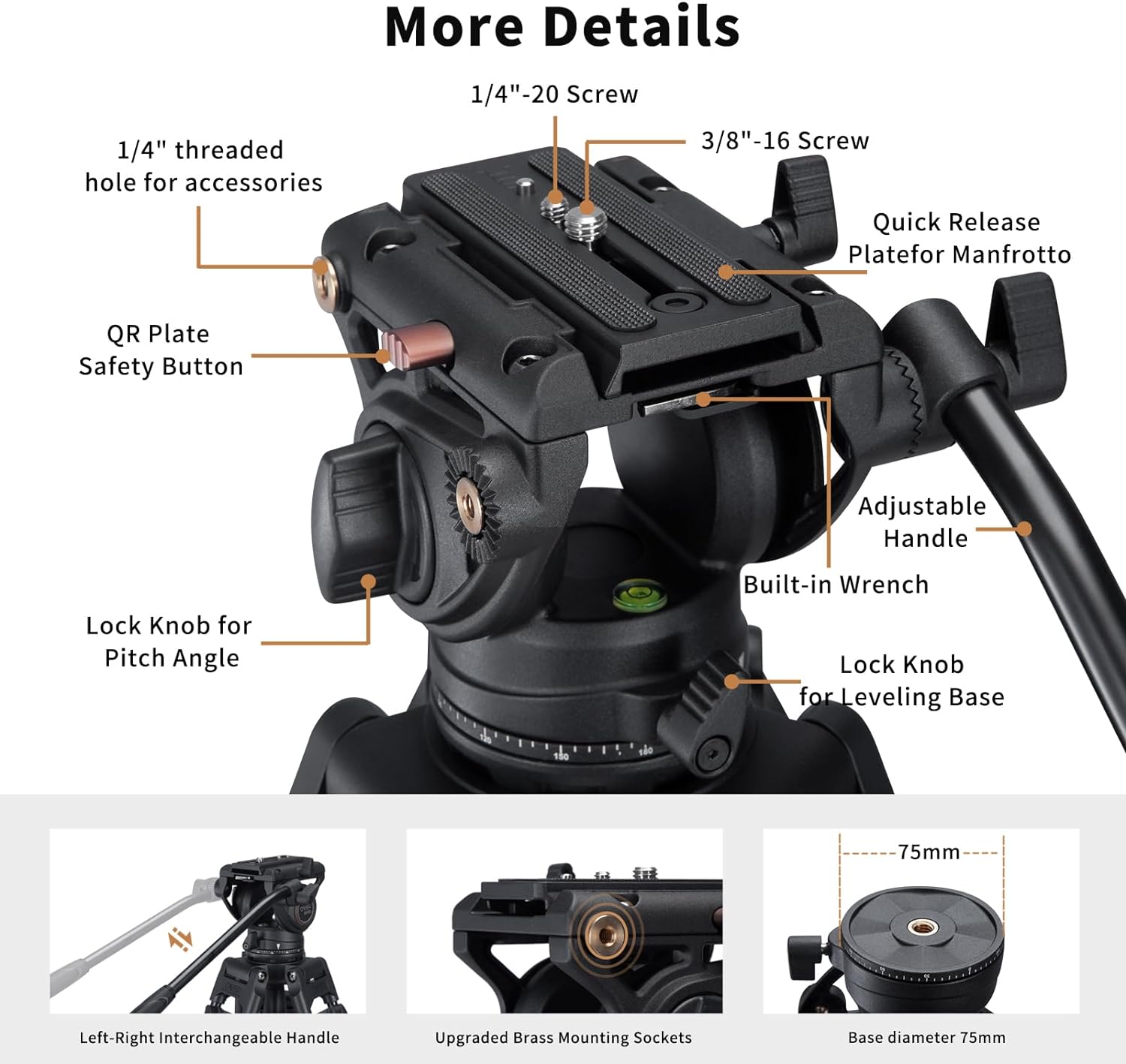 - - Der Fluidkopf verfügt über ein voreingestelltes Gegengewicht, feste Fluidwiderstände sowohl in der Schwenk- als auch in der Neigeachse, bietet 360°-Schwenken und +90°/-70°-Neigung; Die integrierte flache Basis mit 3/8"-16-Gewinde macht den Kopf