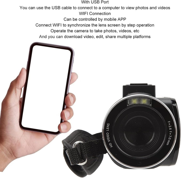 - [WIFI-Verbindung] Die digitale Videokamera kann über die Handy-App gesteuert werden, mit dem WLAN verbunden werden, Schritt-für-Schritt-Bedienung, synchronisierter Objektivbildschirm, Betrieb der Kamera für Fotografie, Video usw. und kann Videos