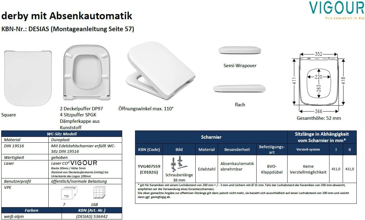 Vigour WC-Sitz derby | mit Absenkautomatik | Edelstahlscharniere | abnehmbar | Art.-Nr. DESIAS