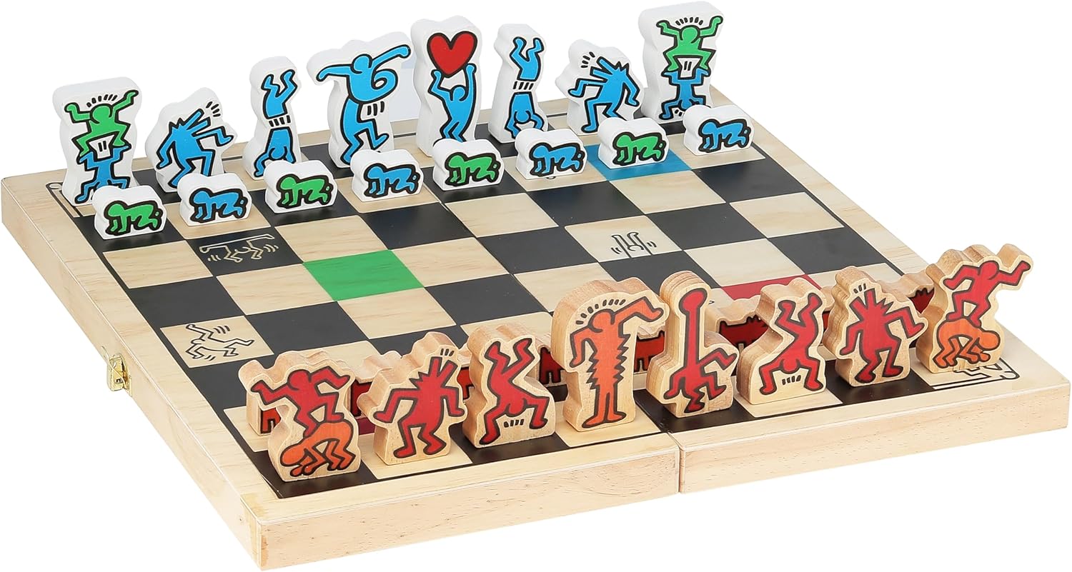 • Ein wunderschönes Schachspiel aus Holz, dessen Zeichnungen aus den ikonischen Motiven des Künstlers Keith Haring stammen.