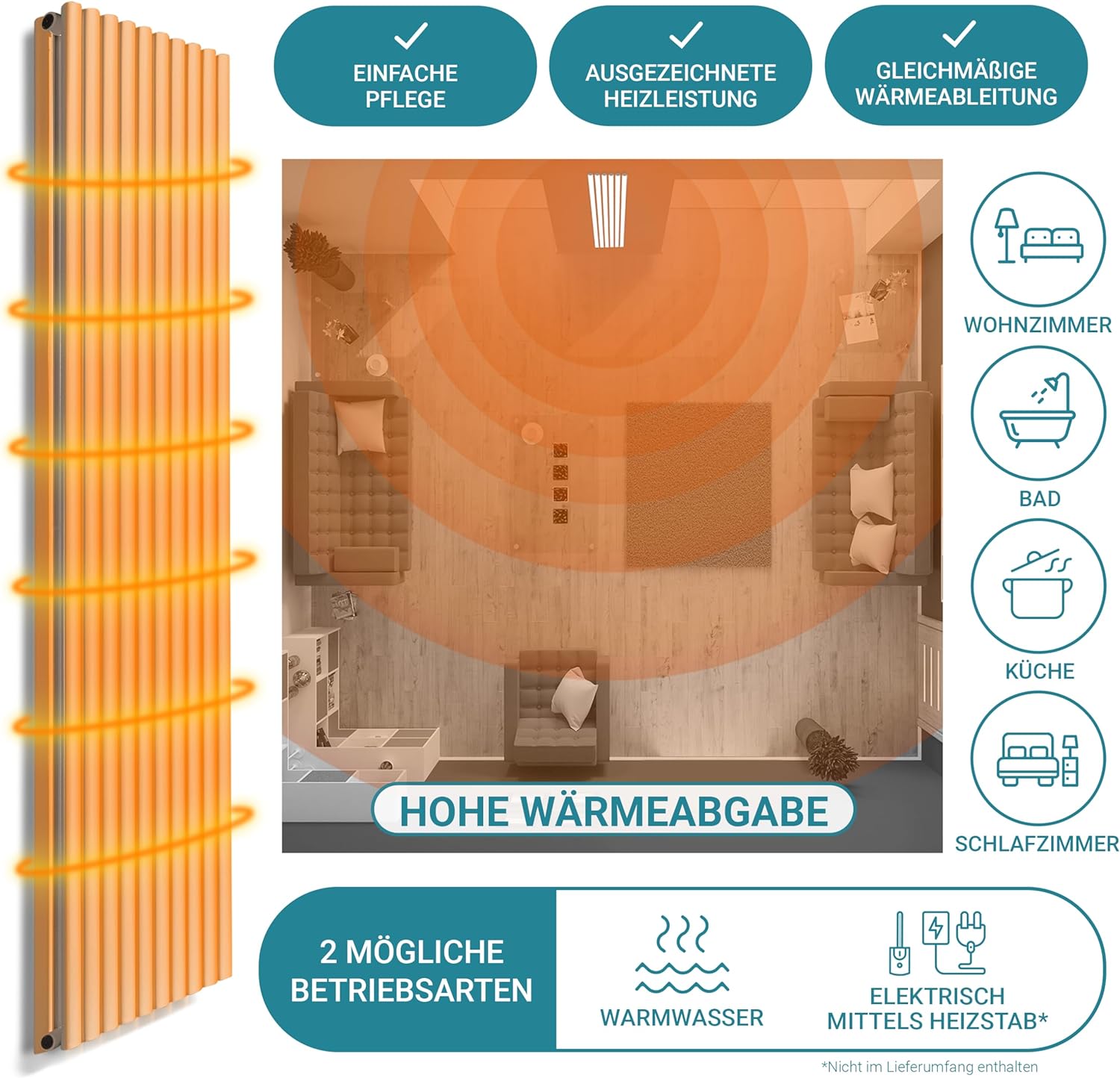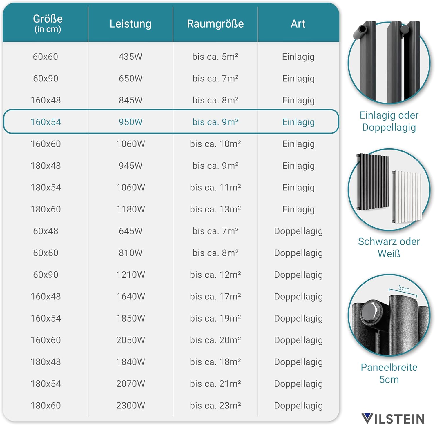 - Leistung: Mit einer Leistung von 950W ist dieser Heizkörper für Räume bis ca. 9m² geeignet. Dank der Auswahl verschiedener Grössen und Leistungen ist es möglich unterschiedliche grosse Räume problemlos zu beheizen. Je nach Dämmung und Haus