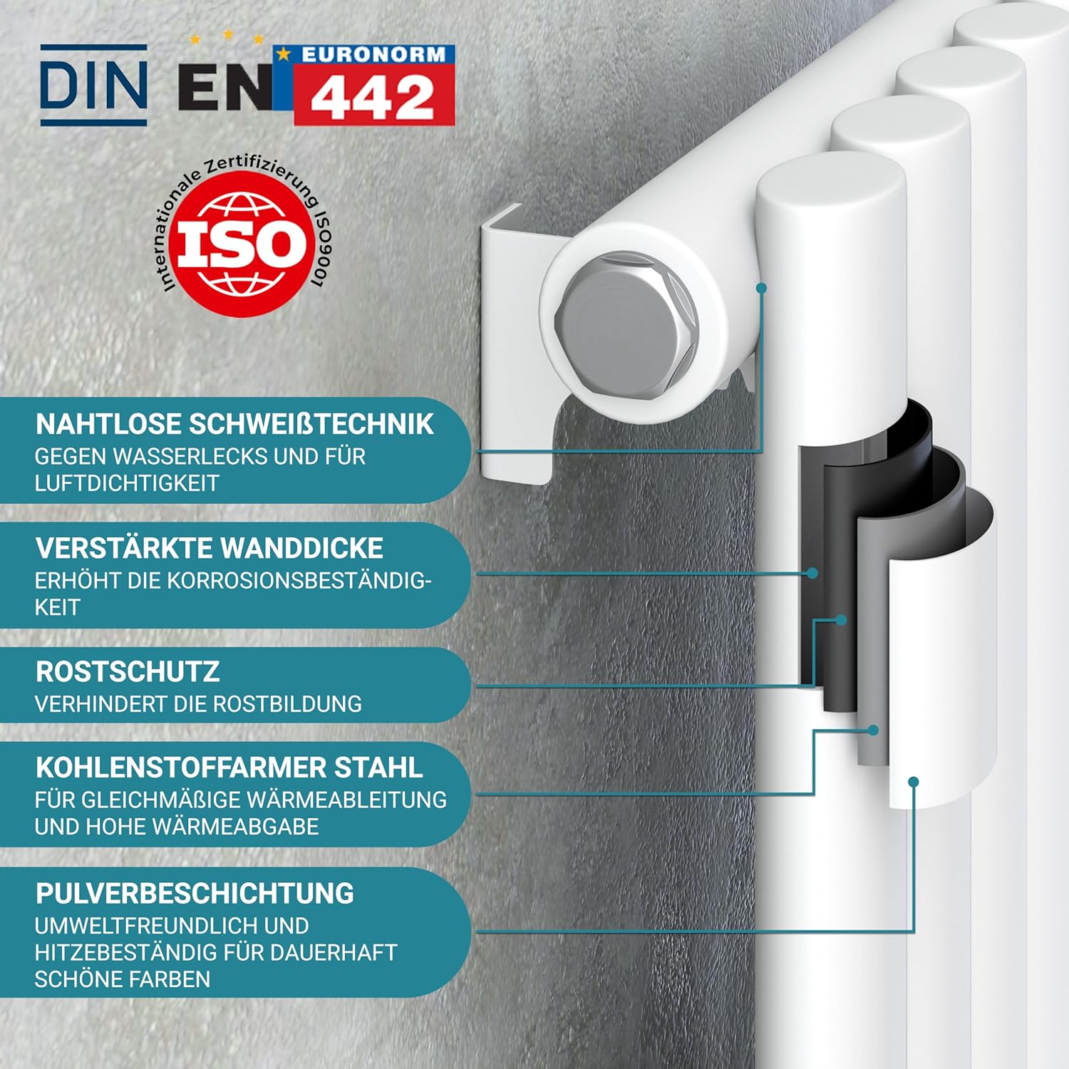 - Sicherheitsstandards: Die Heizkörper entsprechen der europäische Heizkörpernorm EN442 und besitzen die internationale Zertifizierung ISO9001, ein weltweit anerkannter Standard für Qualitätssicherung